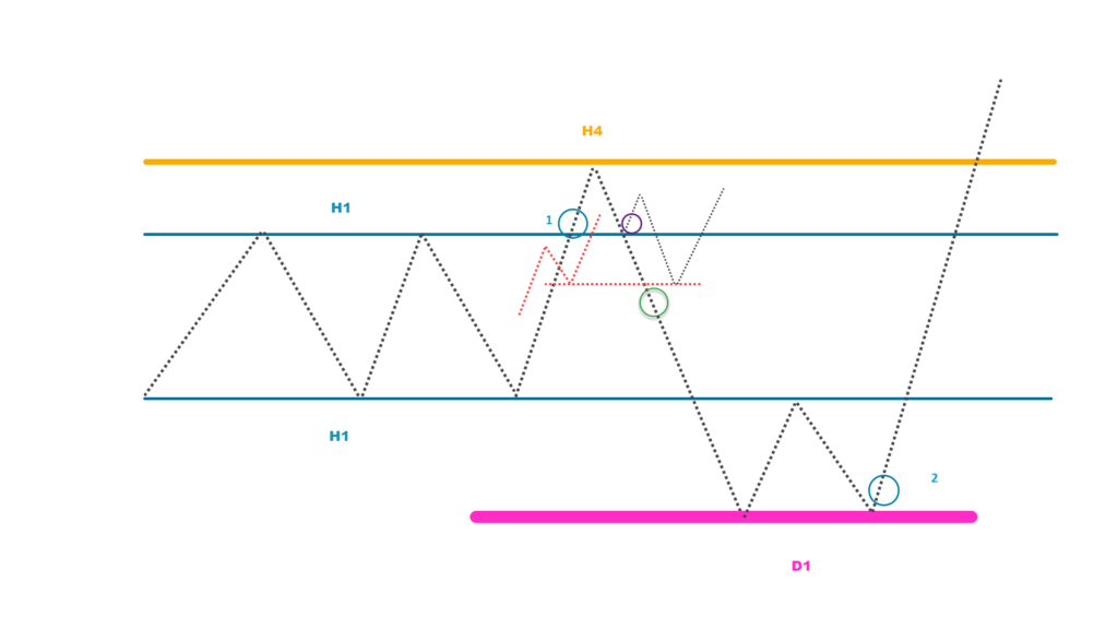 青1ロングは4時間足のレジスタンスを抜けませんが、日足でサポートされた青2ロングなら4時間足のレジスタンスを破れます。