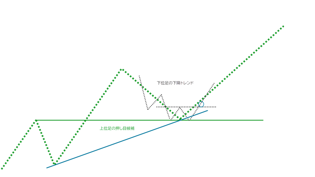 上位足の押し目候補が意識されると、下位足の下降トレンドのショート利確、その利確を狙った逆張りロング、下位足のWボトムによる反転シグナルをきっかけに上位足の押し目買いが入り始めます。