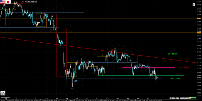 第一目標は先週足安値(W1 LOW)ですが、前日に上値を試しているので運がよければ強者の値(青)まで一旦は下落すると考えました。先週足安値は三尊天井のネックになるので、仮に下抜けても戻りがあります。この戻りにつかまると、長期目線では下がるとしても、短期的に上昇してしまい、行って来いになることがあるので、そうなる前に利食いをします。