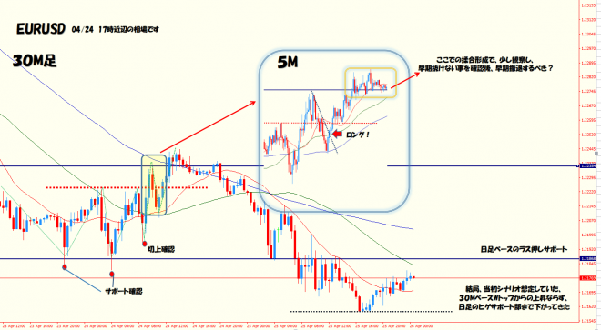 「長期足でのレジサポ場面での反発に対し、短期足のネックに対する値幅と、時間形成」の動画を改めて見返しておりました。信頼できる日足でのサポートラインを背景に、エントリーを行いましたが、マヨ晴れさんは、どのようなエントリーをされるのかぜひお伺いしたいと思いました。