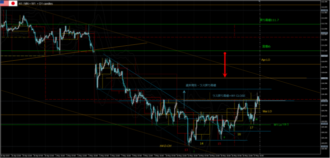 May.13 Mon.円高終焉想定だったが、ファンダ要因で反落、この日の安値が1番底になる。