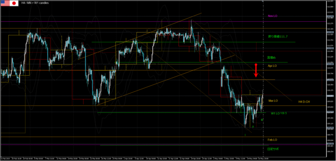 今週の値動き:3月安値で円高進行が止まる想定だったが、もう一段下で底値をつくった。原因はファンダ要因、中国の報復関税措置や、トランプの「13日にも、対中関税第4弾を発表する」などのアナウンスがあり反落。一時的に先週安値を下抜いたが、すぐに安値をを切上げて買い転換のカタチになった。