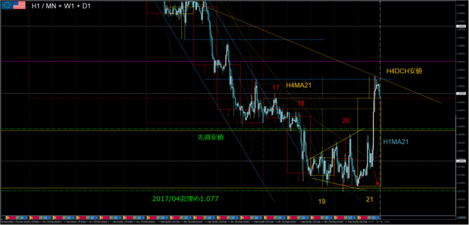 1時間足ブルの視点:いったん戻り売りを受けてから、1.0800×1時間21MAサポート、または、窓埋めレートへの下値試しでロングを考える。