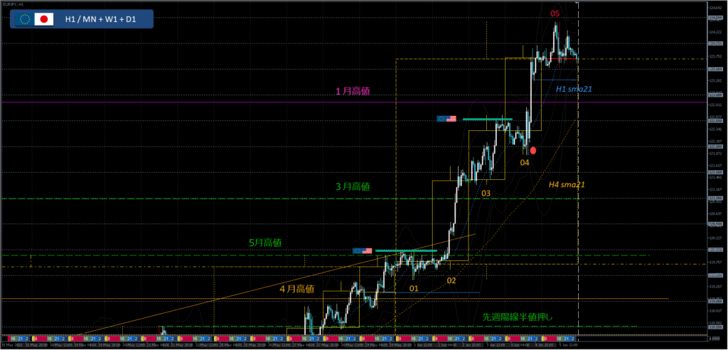1時間足ブルの視点:前日火曜陽線押し目買い、押し目候補は5月高値、または、火曜急騰安値サポートで12月高値まで狙う、4時間sma21サポートも使えそう。