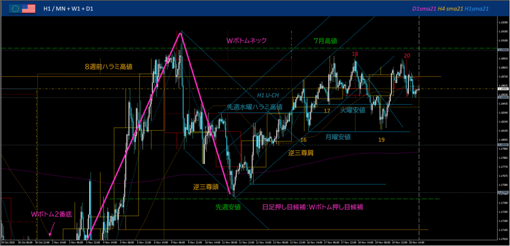 1時間足ブルの視点:①1時間上昇CH安値×前日安値への下押しから、8週前高値に警戒しつつ1.190までロング。②月曜安値まで売られれば買いに備える。