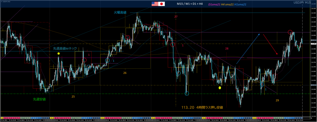 - 火曜高値への買われ方が弱く高値をキリサゲたが、4時間ラス押し安値113.20で反発、前日陰線終値は先週安値でサポート。