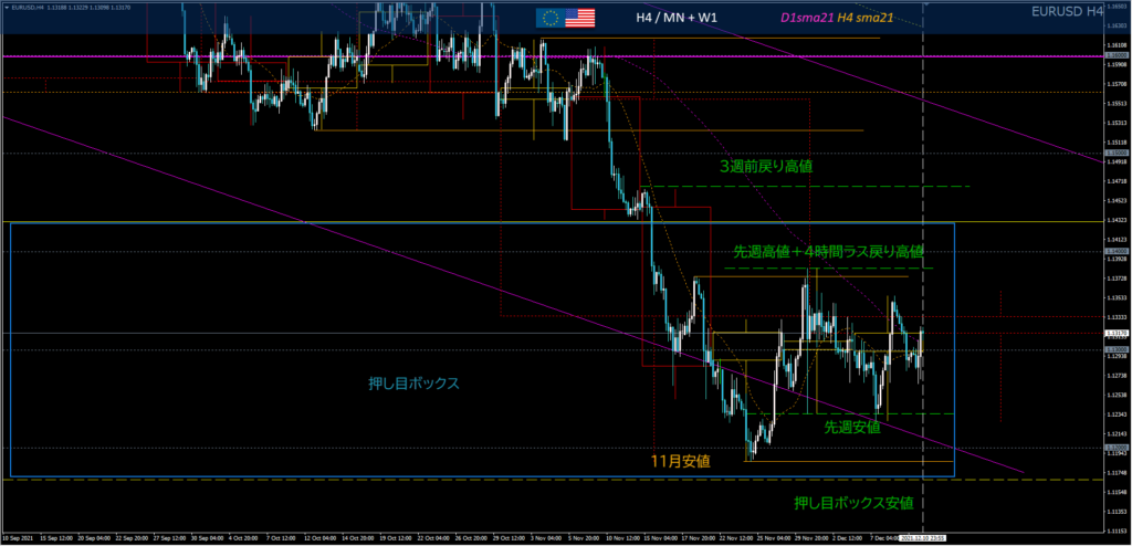 4時間足ベアの視点:①4時間ラス戻り高値(先週高値)から11月陰線戻り売り。4時間ラス戻り高値1.137を試しに上昇して日足SMA21反発で売られるかも。②3週前高値まで買われればショート検討。
