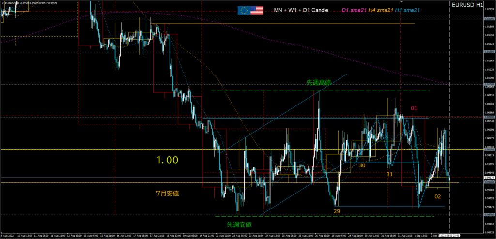 1時間足ベアの視点:7月安値0.995サポート崩れで先週安値抜きショート。