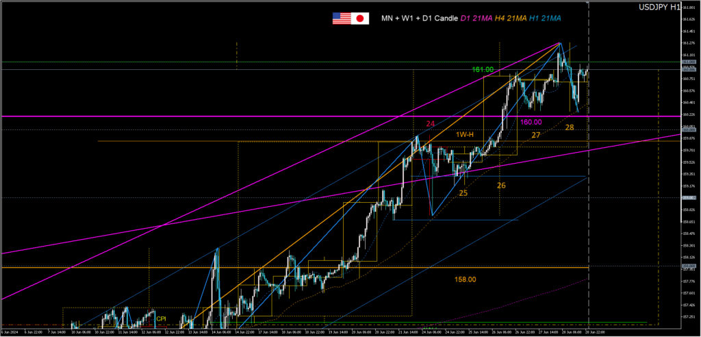 月曜ピンバー安値と介入高値(≒160.00)をTR中段に変更、この”高値圏”を基準としましたが、水曜陽線が介入高値をスンナリ更新。