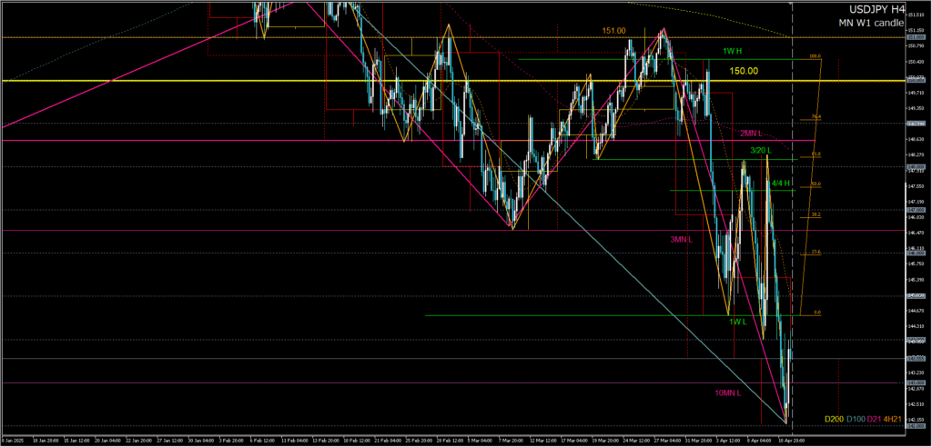 相互関税を90日間猶予するとの報道で、一気に148円へと買い戻しが進み「底入れか?」という雰囲気だったが、一律関税10%や中国に対する145%関税で前回安値へ反落。