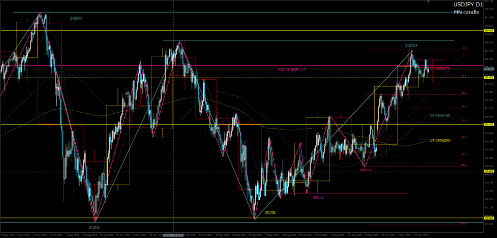 - 11月足は2025年高値裏ネック(156.23)で上ヒゲ反発。12月は 日足レベルの調整フェーズ入りで陰線になる可能性が高い。