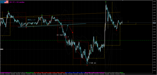 早速のご丁寧な解説大変よくわかりました。上ひげとボリバンが根拠だったのですね。5分足の場合は4時間足終値でもレジになるとは考えていませんでした。幾分売りバイアスがかかっていることもわかっていませんでした。欧州初動のフェイクが減っていることも気付いていませんでした。大変参考になりました。