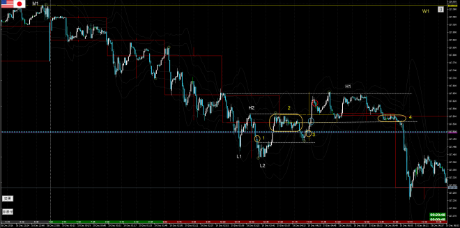 黄1や黄3は、117.500円のブレイクを凝視している、1分足ガン見トレーダーがショートしそうなポイントです。黄1は高値H2で高値を切り下げ、陰線が走り始めたところ。黄3は高値H2でレジスタンス後、黄2レンジをつくりブレイクした戻り売りポイント。1分足だけ見ればエントリーしても良さげに見えます。