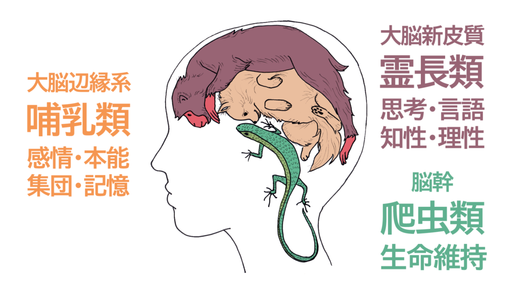 我々は霊長類の頂点に君臨しますが、脳内ではサル・イヌ・トカゲと共棲しています。