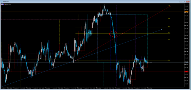 この相場の環境ですが、1時間足をみると9月21の大暴落ハラミになっていて、高値を更新してません。レンジの”半値押し”に、そこまで強い意味はありません。基本的にフィボナッチ数は、トレンドフォローの押し目買い・戻り売りに使うものなので、その辺を混同しないようにしましょう。