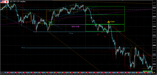 4時間足高値切下げに加え、11月安値のWボトム・ネックラインを上抜いた”ピンク・強者の安値”を下抜き返して、11月安値を割りやすい状況がつくられた。ひとまず、11月安値まで戻り売りは可能だが、FOMCが深夜にあるので、大きなモメンタムは得られないかもしれない。