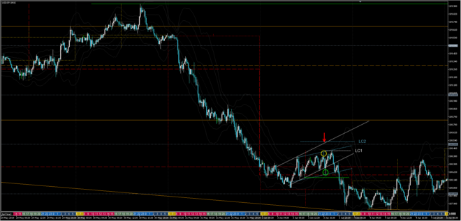下降フラッグ高値+108.5のキリ番を上抜けたLC2辺りが損切りレートになり、5分足が実体抜けして、次の5分足をみてフェイクになりそうになければ損切ります。