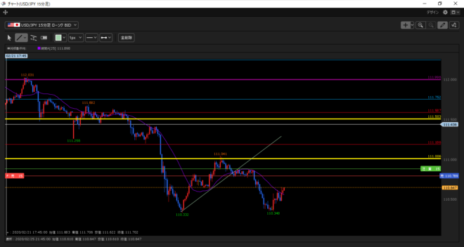 トレーディングレンジは週足の高値112.000から日足押し目候補110.000付近(紫の線)