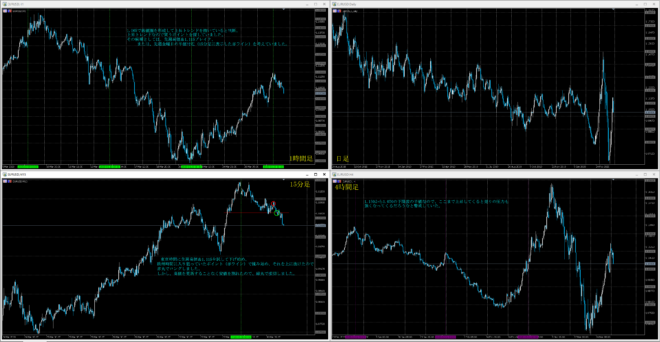 本日は、自分の環境認識で見落としている点がないか見ていただきたく、迷晴れBOXに投稿させていただきました。添付した画像の右側が長期足のチャートで、上が日足、下が4時間足です。左側の上が中期足の1時間、下が短期足の15分チャートです。