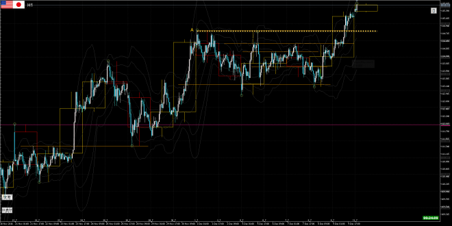 確かに、黄高値ラインは注目されていますが、そこでピタリ止まるかどうかは、止まってみないとわかりません。1時間足が上ヒゲを出したのは4日離れていて、間近ではスンナリ抜けています。ボクなら、黄高値ラインをブレイクさせた起点(強者の値1)に注目します。114.50レンジをブレイクした結果もあるので、上昇しやすい条件はそろっています。
