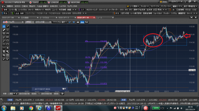 今回の質問ですが3/14火曜日の17:00頃です。4時間足をみて動きを見て目線を上、(画像の赤丸の動きです)