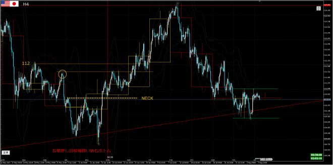 109.00Wボトムは長期波の押し目買い候補で、安値切上のW右ボトムでもあります。大きな波の押し目でネックラインも上抜いているので、ここから暫くの上昇を意識するところです。