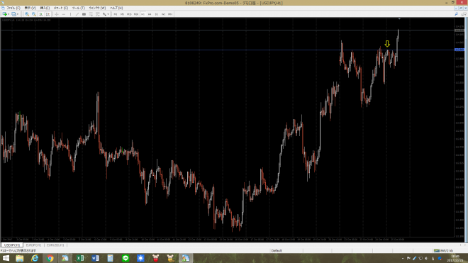 もちろんアップトレンドですので、114.00付近のラインを抜ければアップトレンド継続ですので、損切りはその直上に置いていました。