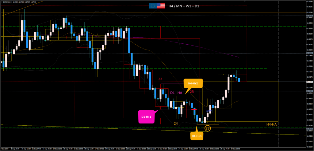 1.160に注目。4本前陰線(9/23)ハラミ足を9/25陰線が実体抜け。25日陰線をブレイク足とみて、1.160+ブレイク足安値を9/28(月)足が下抜けしたらショートというシナリオ。