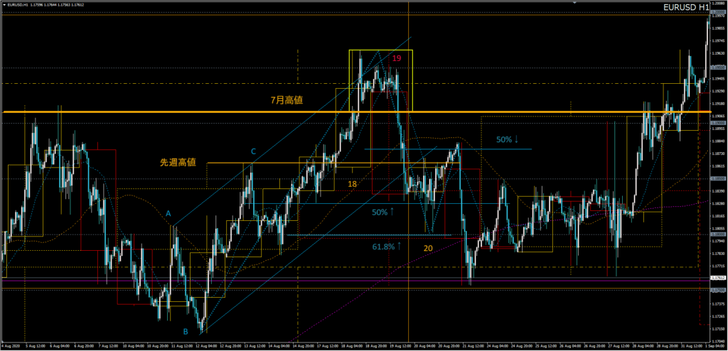 ブル派は黄ブロックを7月高値ブレイクとみた押し目買い。押し目候補は先週安値↑50%強者の安値と1.180/61.8%。