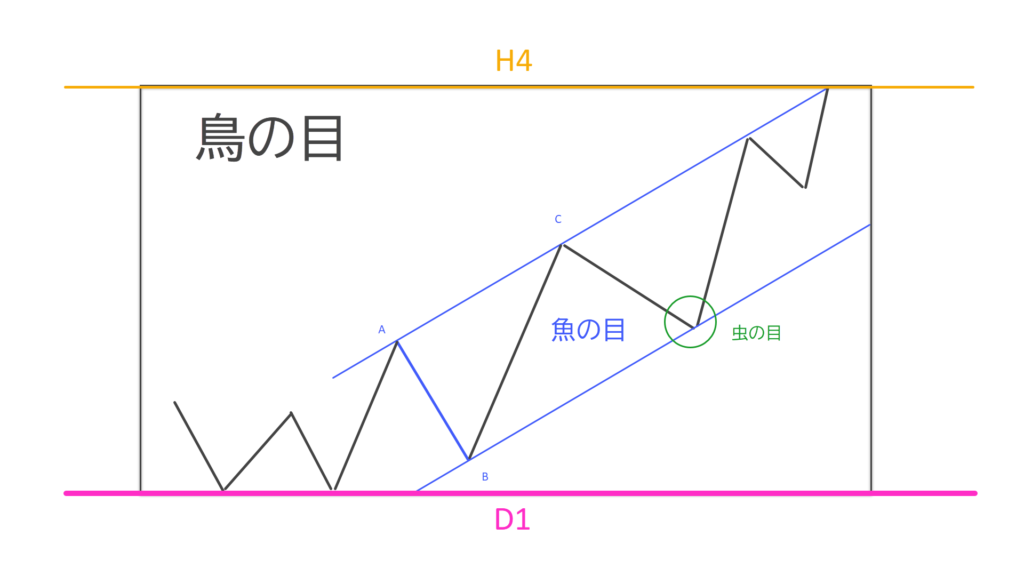 おつかれさまです!マヨハレ式チャネルラインは「魚の眼」となり、泳ぐ魚の動きを予測できます。全体俯瞰の鳥の眼と魚の眼を養えば、安心・安全な心境で相場と対峙することができます。