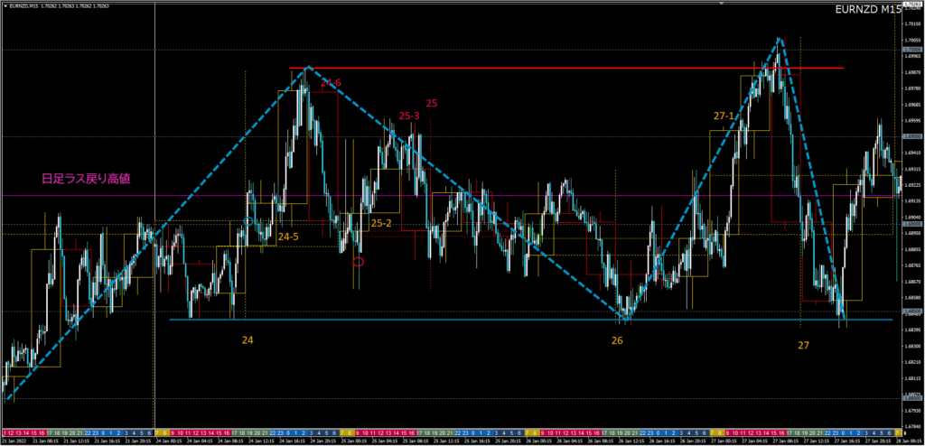 例えば、27日陽線終値の「日足ラス戻り高値ブレイク」を待って28日にロング、あるいは、10月高値の反発でロングなど、ワンセット思考で10月高値を割るまで何回かロングを試せるところになります。