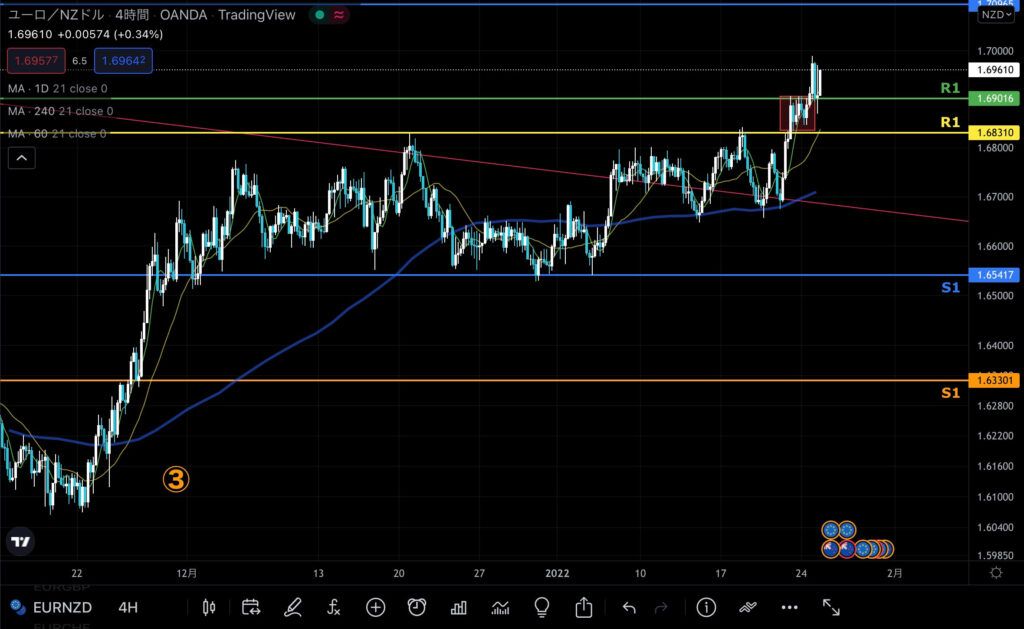 利確目標は、青水平線S1と黄色水平線R1のレンジのE値100%1.709付近。