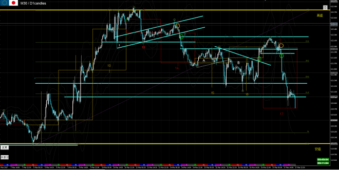 14日から15日にかけて”緑ミニ三尊”をつくりました。左のダブルトップと合わせての連続パターンで、かなり下に行きやすいカタチになりましたが、”FOMC”でサプライズがあれば、どうなったかわかりません。