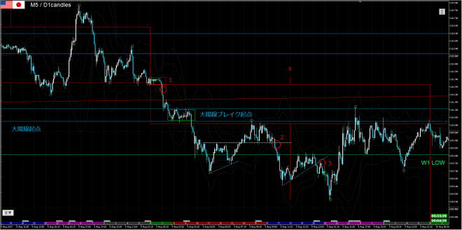 前日の動きで110.00Wボトムが崩される可能性が高まったので、赤1から大陽線起点(青水平線)までショートできます。下がるほどに110.00Wボトム失敗を意識する人が増えてくると考えられます。