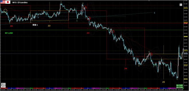 夜のECB総裁ドラギさんの発言(ユーロ圏経済好調)で急騰したが、手前にWボトムがあって、赤切下げラインの裏で、ちゃんと反発(青2)している。