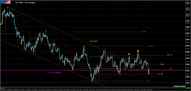 流れ:前日足終値は11月終値+4時間足キリアゲライン(H4-1)に支えられたが、ここを割ると、1.130今年最安値の支えが怪しくなる。