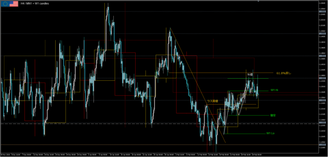 Feb.25 Mon.先週高値と1時間強者の安値のレンジ中、安値は切り上がったが先週高値は未更新。