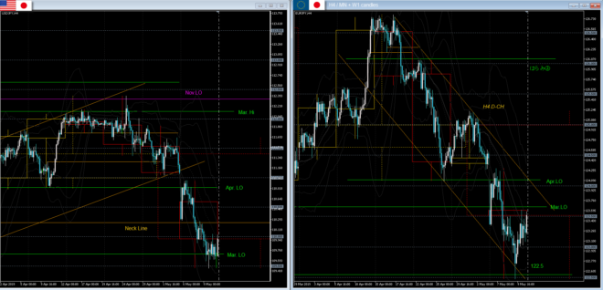 買い手目線:日足サポート122.5でのWボトム2番底逆張り、又は、逆三尊右肩123.0逆張り。