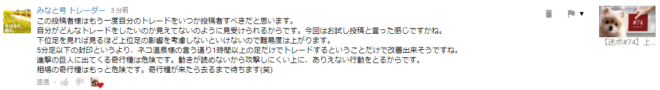 最近、おかげさまでハイレベルなコメントがとても増えてきました。迷晴れボックス(ブログ右サイドバナー)では、ビギナーの負けトレード投稿を受けつけてますが、先回の動画配信をあとも、参考になるコメントを沢山頂きましたので、いくつかご紹介します。