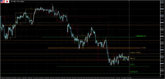 5月最終週下降波戻り売りと108.0サポート押し目買いで競りそうな雰囲気。