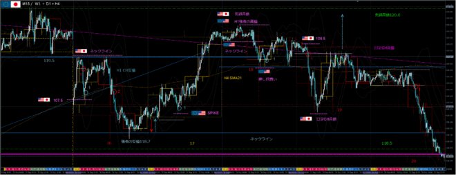 月曜日の値動き:東京時間、ミニネック119.5レジスタンスで赤1ショート・スキャル。続いて、1時間CH安値+ドル円107.5サポートで青1ロング、119.5でアウト。