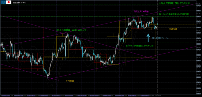 買い手目線:先週高値121.5をブレイクすれば、日足CH高値までロング、121.0FOMC安値サポートでロング。