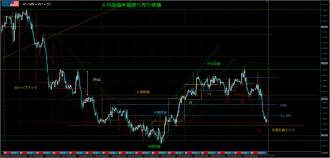 売り手目線:Wトップへの上値試しから戻り売り。戻り目候補は逆Nゾーン、戻りマックスは1.114強者の高値。