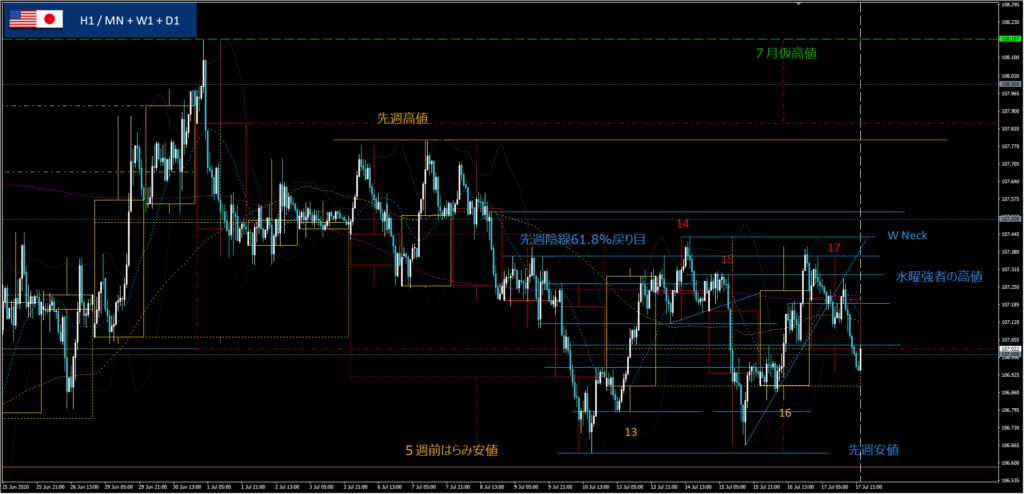 下値試し完了後に107.0上抜き返しで青1ロング、Mトップで半決済、深夜に押し目買いされ水曜強者の高値でアウト。