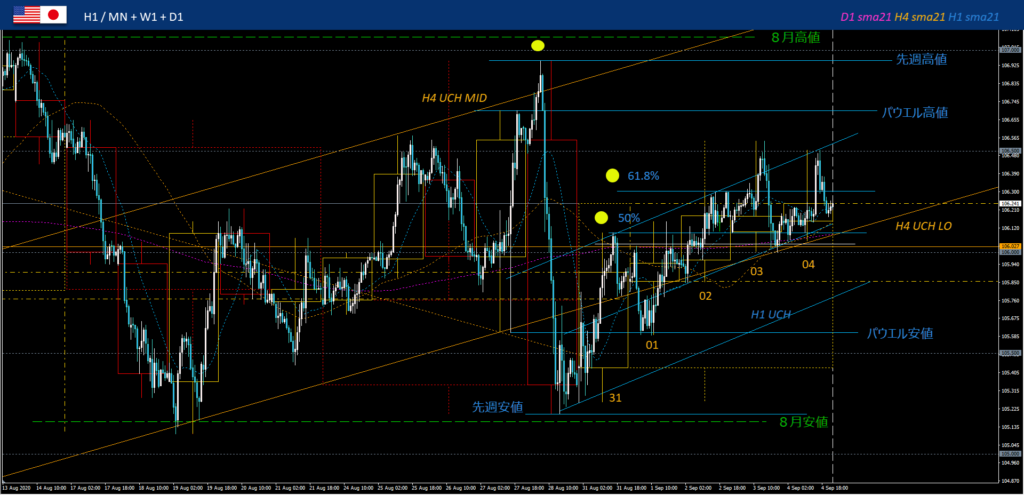 東京時間、金曜急落半値戻し106.0高値切下げで赤1戻り売り、先週安値2番底狙いはパウエル安値サポートでアウト。