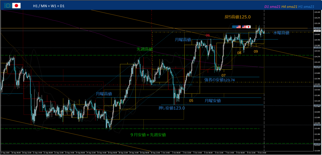 4時間足ブルの視点:①先週安値+9月安値付近まで売られて2番底をつくればロング。②先週高値Mトップ崩れで2週前高値までロング。