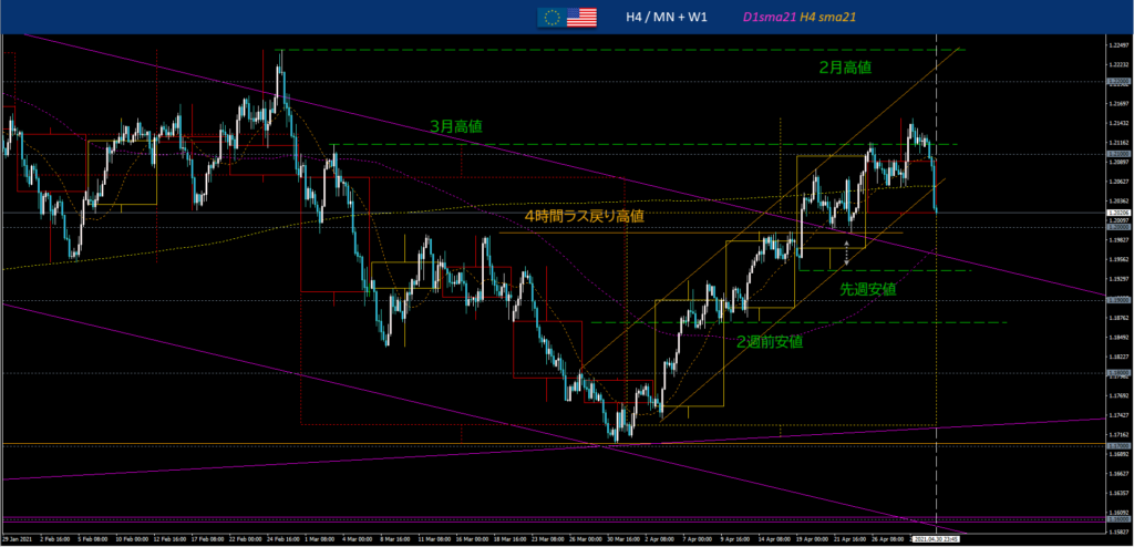 4時間足ベアの視点:①3月高値付近でレジされれば、先週陽線Nボックス(1.2000から先週安値)までショート。②2月高値まで買われればショート検討。
