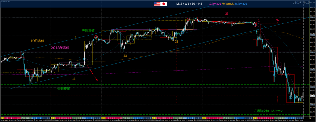 25日米感謝祭の日に戻り目をつくると、26日金曜日は新型コロナウイルスの新変異株がリスクオフの発端となり、それに加えて米感謝祭明けの薄商いで値が振れやすいことも重なって一方的な円高相場となった。