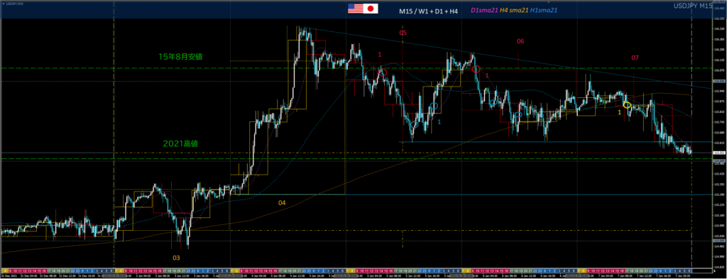 4時間足ベアの視点:21年高値と15年8月安値のWレジスタンスを意識。①ダマシ高値(15年8月安値上抜け)狙いのショート。②117.0まで買われればショート検討。