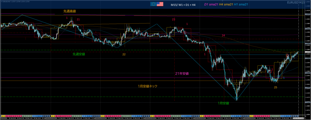 東京時間、先週安値手前1.13付近に15分Wボトムを確認後、15分戻り高値レジスタンスを注視。